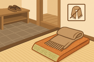 茶道の席ではショールも外出着の一部として扱われます。茶室は屋外のほこりを持ち込まない清浄な空間とされているため、待合や席入り前にショールを必ず脱いでおきます。